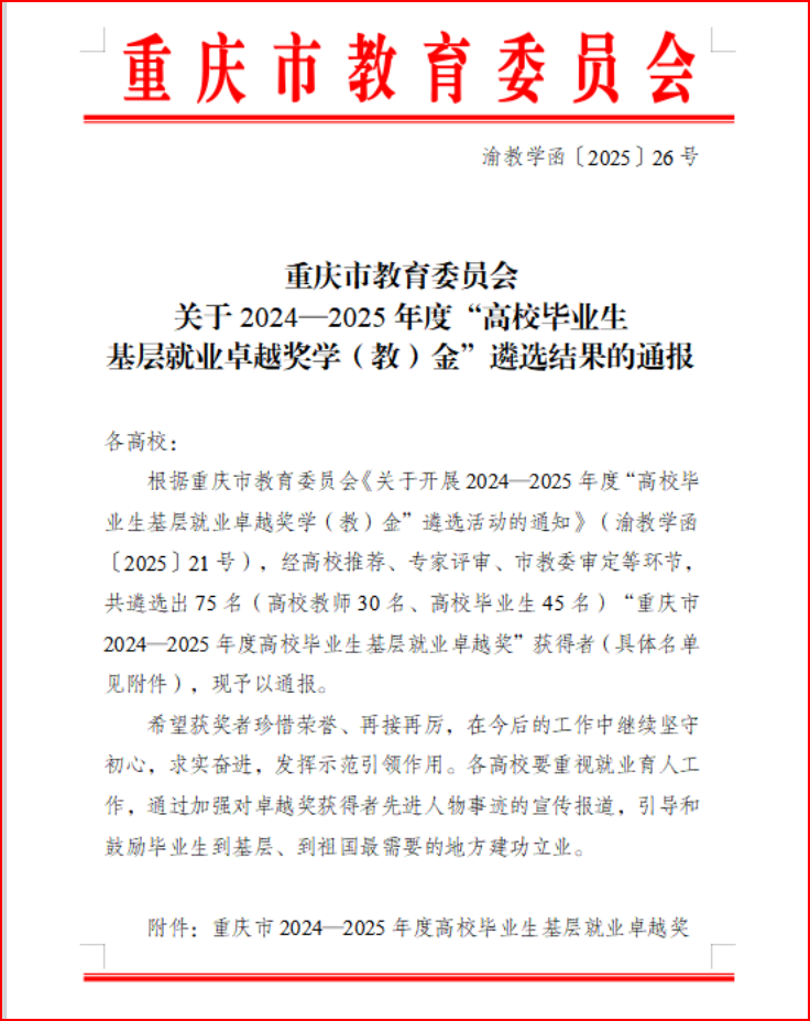 近日,重庆市教育委员会公布了2024-2025年度“高校毕业生基层就业卓越奖学(教)金”遴选结果。我校智慧城市建设学院元云丽老师、智能制造学院2021届自动化专业本科毕业生黄庆,分别荣获高校教师类和毕业生类奖项。