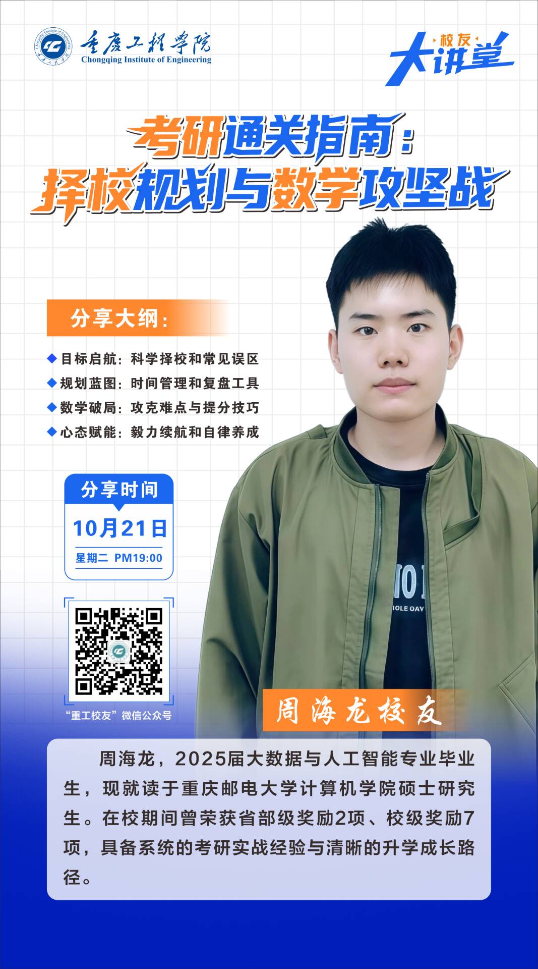 10月21日晚,学校就业指导中心通过线上平台成功举办“校友大讲堂”活动,邀请2025届优秀校友周海龙围绕考研规划与数学备考展开专题分享。本次活动吸引了全校3900余人在线参与,为有考研需求的在校学生提供了实用经验与方向指导。