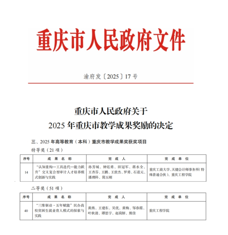 本网讯(文/图 党委宣传部)近日,重庆市人民政府公布2025年重庆市教学成果奖获奖名单,重庆工程学院凭借两项创新育人成果斩获佳绩,共荣获高等教育(本科)教学成果奖2项,其中特等奖1项、二等奖1项,彰显学校在教育教学改革与人才培养模式创新中的突出成效。