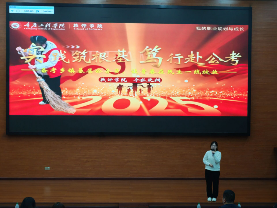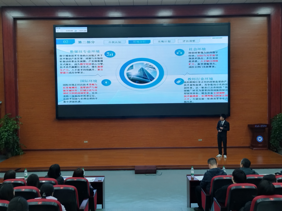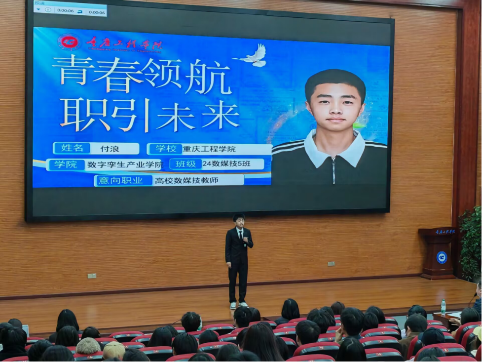 比赛现场气氛热烈,选手们依次登台,围绕个人职业规划、技术能力、项目经历等内容进行精彩陈述。尽管每位选手追求的目标各异,有的扎根基层,有的聚焦软件开发,有的深耕数据算法,有的专注数字孪生可视化,但他们共同展现出对未来的清晰憧憬与坚定的职业追求。台上选手斗志昂扬、精神饱满,台下观众聚精会神、座无虚席,整场赛事洋溢着青春与专业的双重气息。